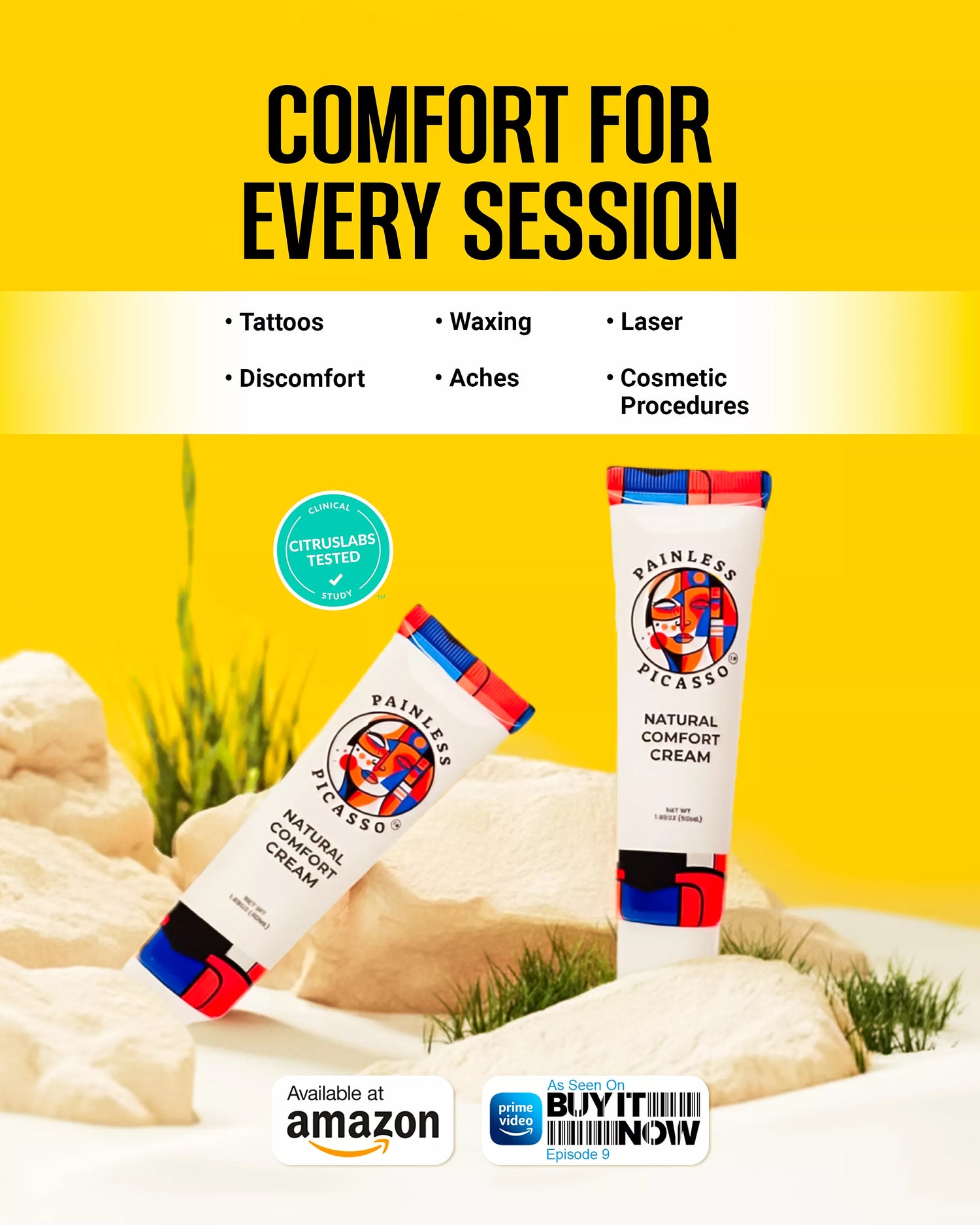 At Painless Picasso, we offer a natural comforting cream for tattooing, piercing, waxing, laser treatments and everyday body or foot aches. Say goodbye to discomfort with Painless Picasso.